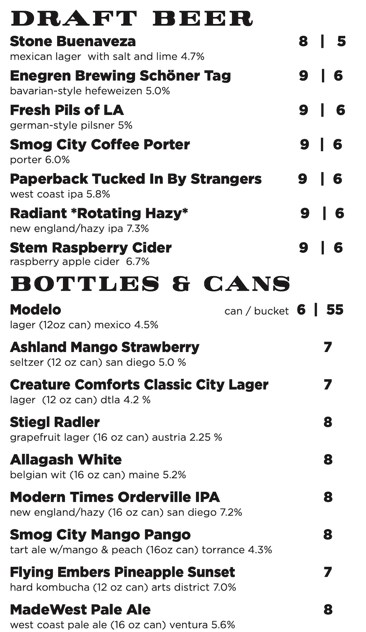 ERB is the place for All Tomorrow's Parties. We welcome you inside, where you are greeted by a long sleek bar serving up the hand-crafted cocktails, boutique small production wine, and exceptional beer. The mood is warm, welcoming, and energetic. As you make your way to our expansive patio, you'll find comfort in the casual picnic benches, bistro lighting, and Los Angeles landscape. Platters of perfectly executed food options from James Beard Award-Winning Chef Matt Molina are available for pre-order at least a week in advance, served buffet or family style.